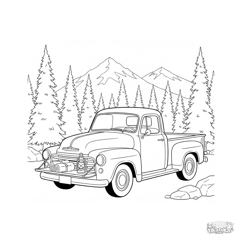 Ausmalbild eines Retro-Pickups, der am Bergcampingplatz in der Dämmerung geparkt ist. Für Jungen von 4 bis 6 Jahren.
