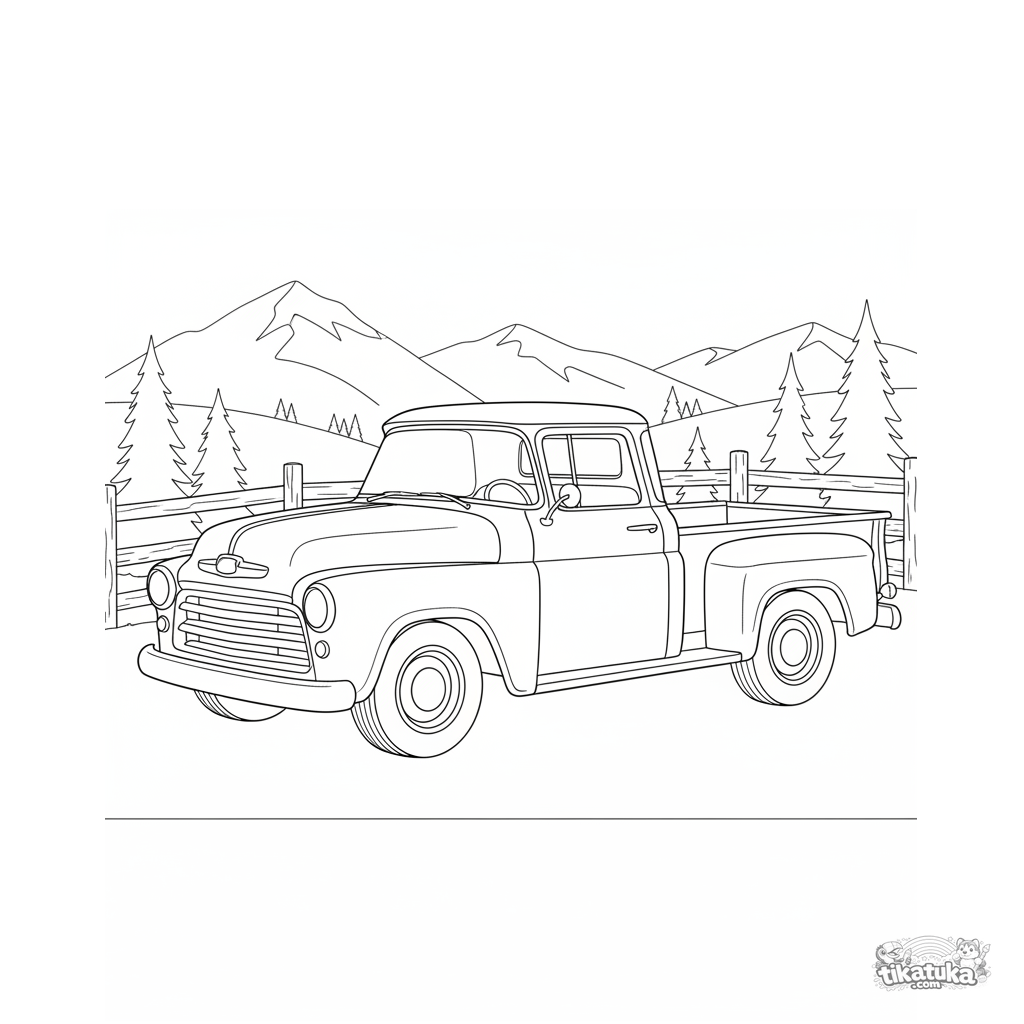 Ausmalbild für Jungen 4-6: Ein Retro-Pickup, der an einem Bergaussichtspunkt parkt. Detaillierte, aber klare Zeichnung für Fahrzeugfans.