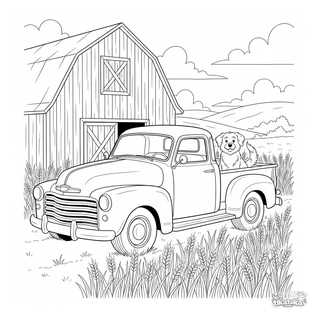 Ausmalbild für Jungen 4-6: Ein stylischer Retro-Pickup aus den 1950ern ist neben einer Holzscheune auf einem goldenen Weizenfeld geparkt. Detaillierte Szene.