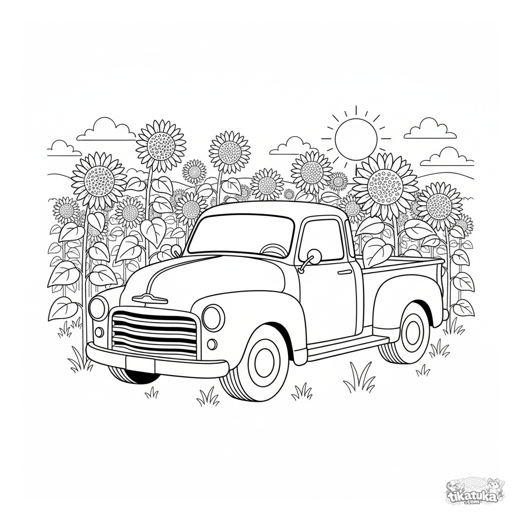 Ausmalbild für Jungen: Ein Retro-Pickup, geparkt in einem Feld hoher Sonnenblumen. Für Kinder von 4-6 Jahren.