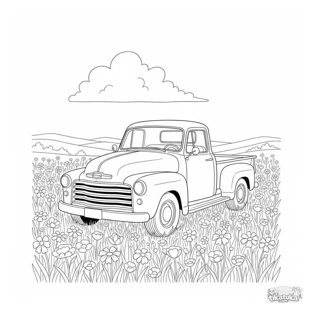 Ausmalbild für Jungen 4-6: Ein stylischer Retro-Pickup aus den 1950ern, auf einem Wildblumenfeld geparkt. Detaillierte, aber klare Zeichnung.