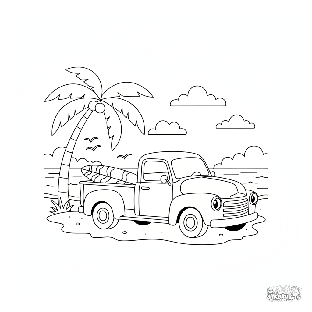 Ausmalbild eines Retro-Pickups aus den 1950er Jahren am Strand. Für Jungen von 4-6 Jahren. Der Truck hat ein freundliches Gesicht, ein Surfbrett auf der Ladefläche und eine Palme im Hintergrund.
