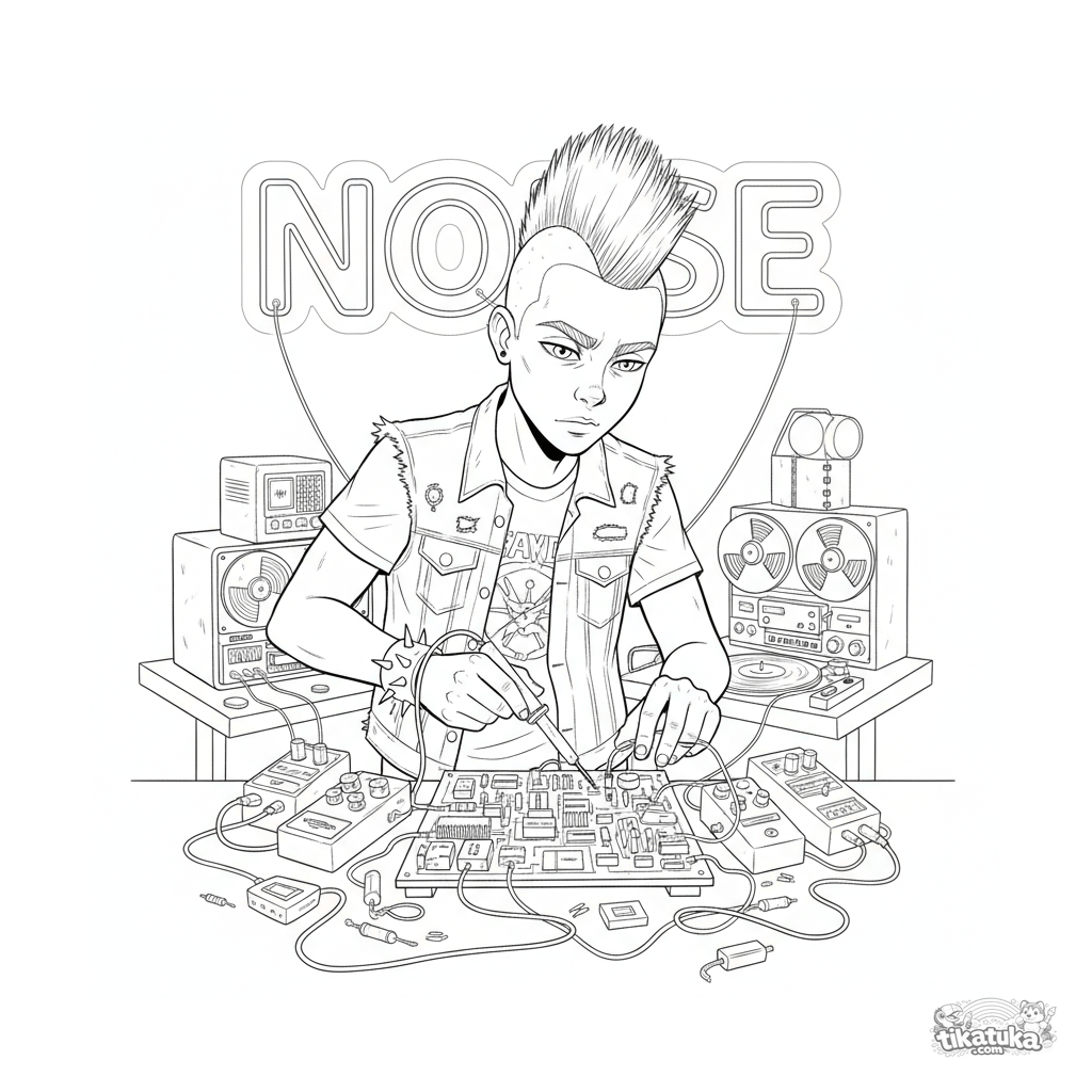 Ausmalbild für Kinder 10-12: Ein Hacker im Punk-Stil lötet im Keller einen DIY-Synthesizer. Komplexe Szene mit Neon-Schild, Audio-Geräten und Werkzeug.