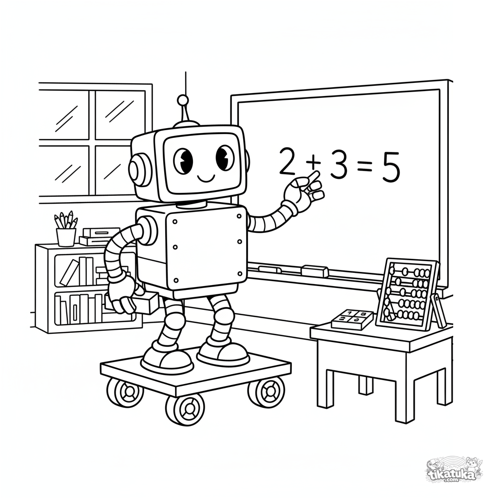Ausmalbild für 7-9 Jahre: Ein Retro-Roboter-Assistent schreibt eine Mathegleichung mit Kreide an die Schultafel. Alter Cartoon-Stil, Abakus und Zahlenkarte.