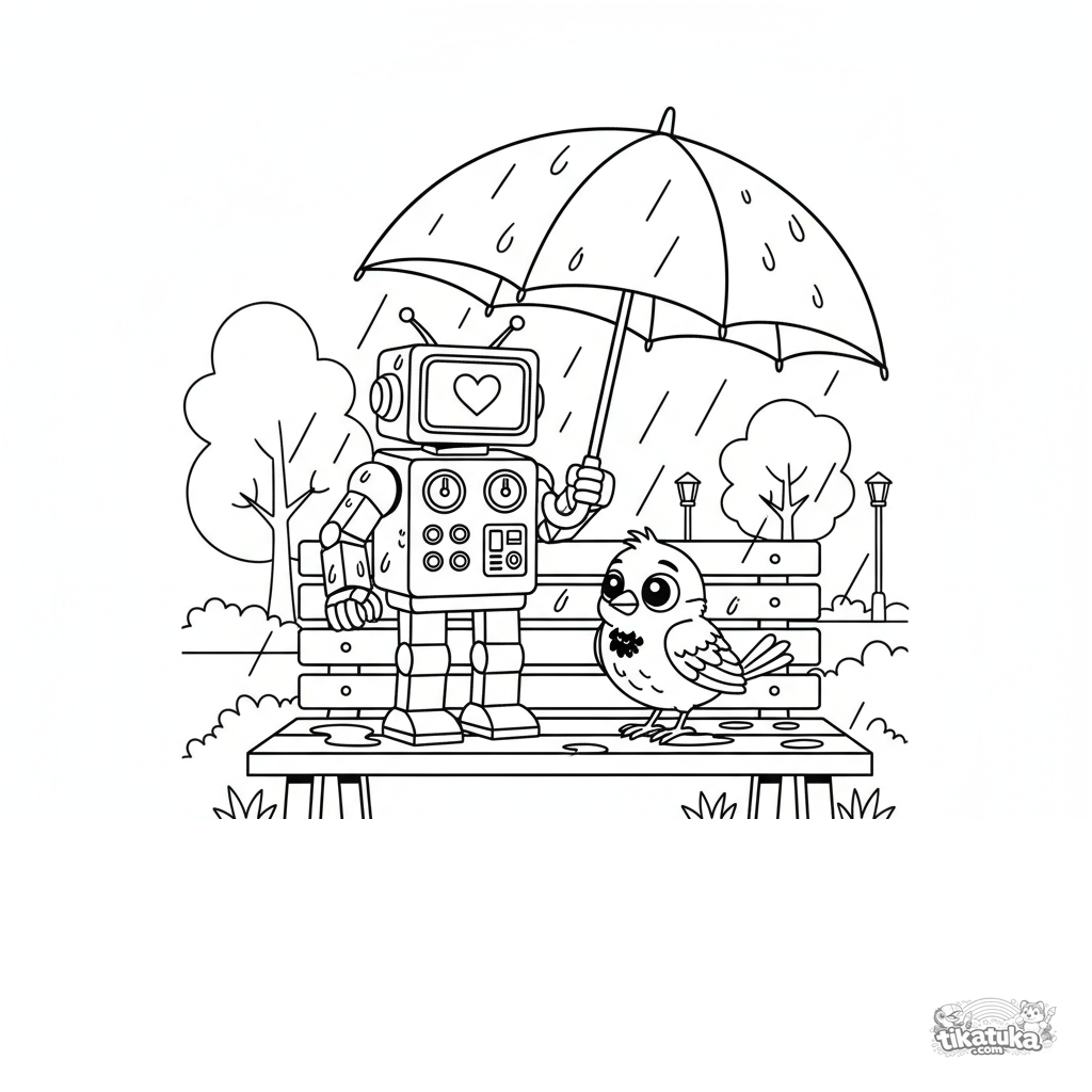 Ausmalbild für Kinder 7-9: Ein freundlicher Retro-Roboter im 80er-Stil hält einen Schirm über einen nassen kleinen Vogel auf einer Bank im Herbstregen.