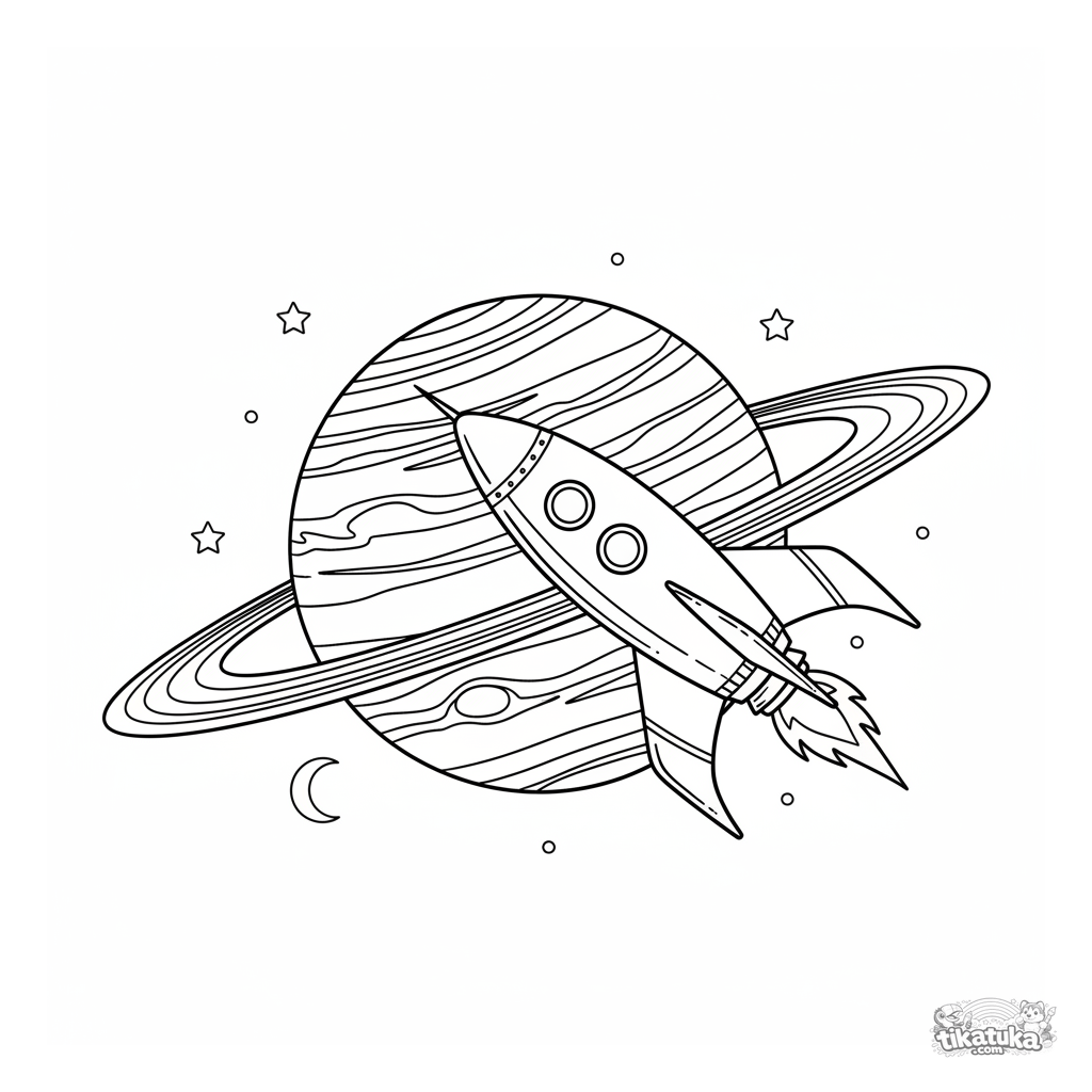 Ausmalbild einer Retro-Rakete, die einen Ringplaneten umkreist. Für Kinder von 5-8 Jahren. Zeigt einen detaillierten Gasriesen, Sterne und einen Mond. Volles Raumschiff, breite weiße Ränder.