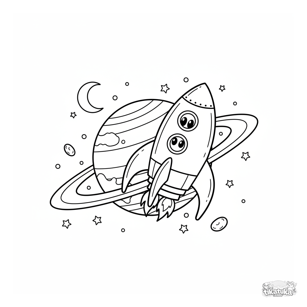 Ausmalbild einer Retro-Rakete im Stil der 50er Jahre, die einen riesigen Ringplaneten umkreist. Für Kinder von 5 bis 8 Jahren.
