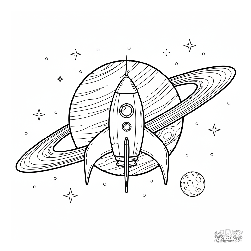 Ausmalbild einer Retro-Rakete mit großen Flossen, die einen Ringplaneten umkreist. Für Kinder von 5 bis 8 Jahren.