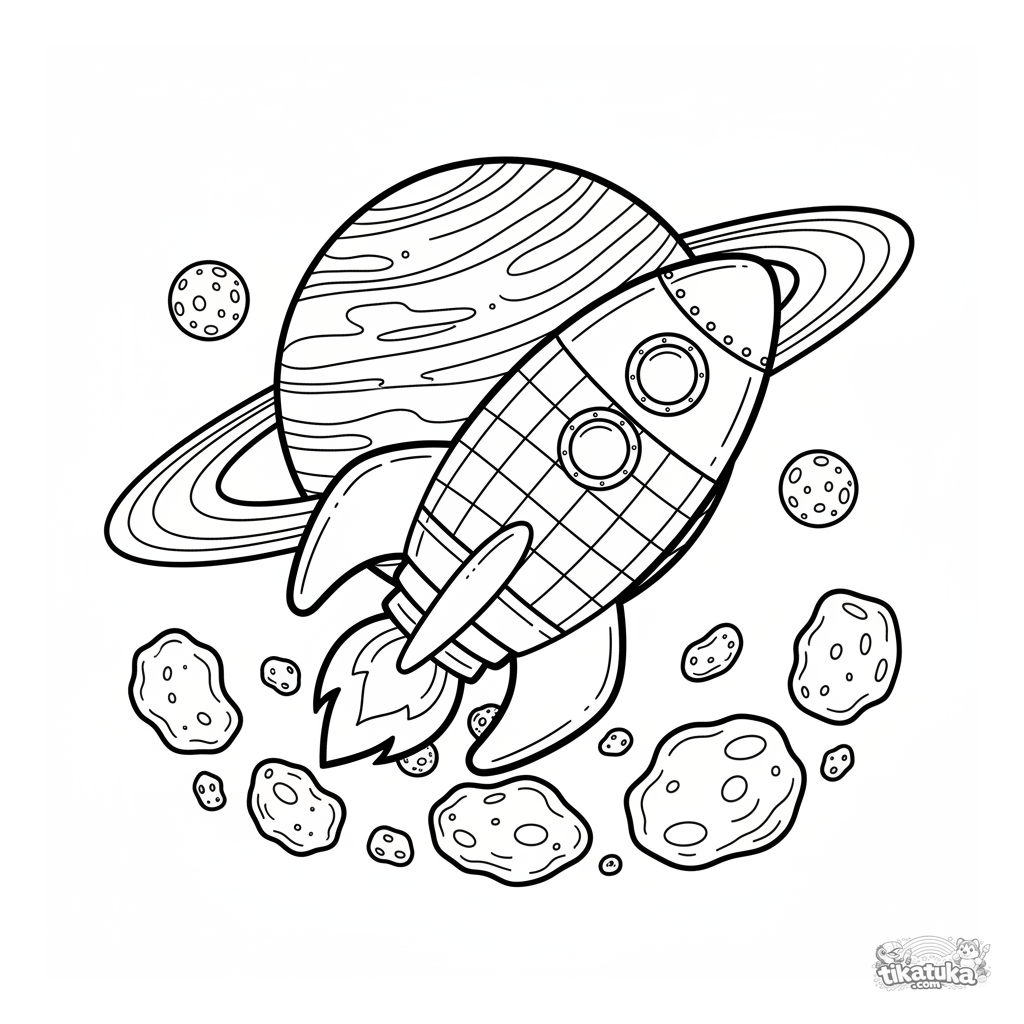 Ausmalbild für Kinder von 5-8 Jahren: Eine stylische Retro-Rakete fliegt nahe einem Riesenringplaneten und einem Asteroidenfeld. Klare Umrisse auf weißem Hintergrund.