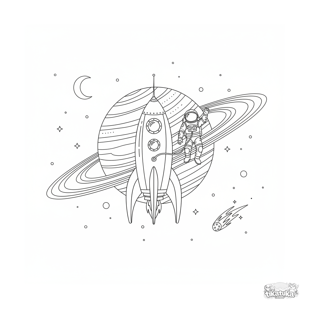Schwieriges Ausmalbild: Eine Retro-Rakete umkreist einen ringförmigen Gasriesen. Für Kinder von 8-12 Jahren. Ein astronaut schwebt in der Nähe, vor einem Hintergrund aus Sternen, einem Mond und einem Kometen.