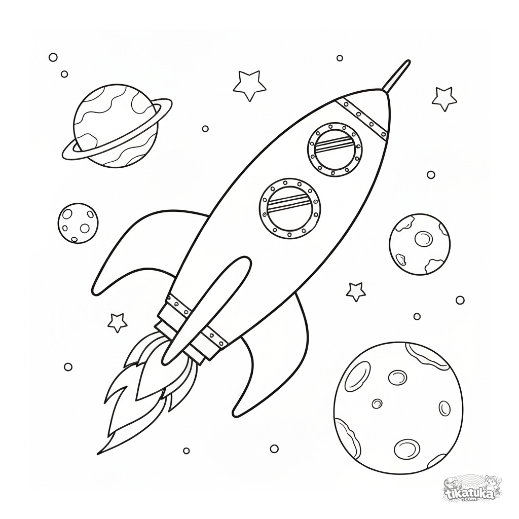 Ausmalbild einer Retro-Rakete im Stil der 1950er Jahre, die zwischen Planetenumrissen und Sternen auf weißem Hintergrund schwebt. Für Kinder von 5-8 Jahren. Einfache Formen mit breiten Rändern zum Ausmalen.