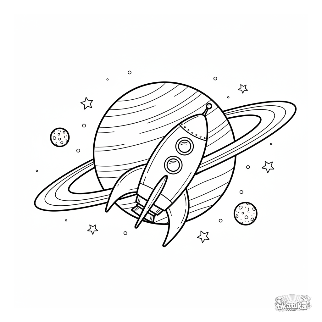 Ausmalbild für Kinder 5-8: Eine Retro-Rakete im Stil der 1950er Jahre treibt im Orbit um einen riesigen Ringplaneten. Eine realistische Weltraum-Szene.
