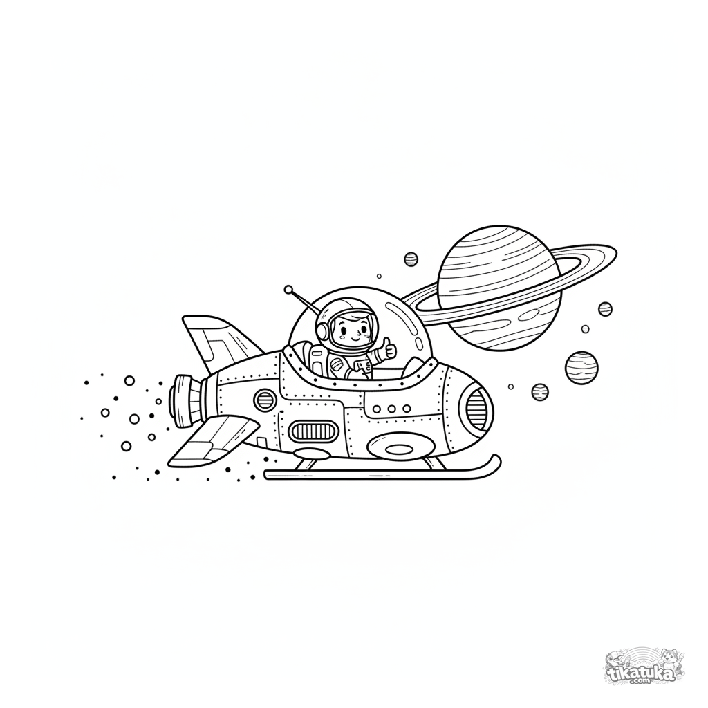 Retro-futuristisches Ausmalbild eines Raketenschlittens, der an einem riesigen Ringplaneten vorbeirast. Dynamische Weltraumszene für Kinder von 6-9 Jahren.