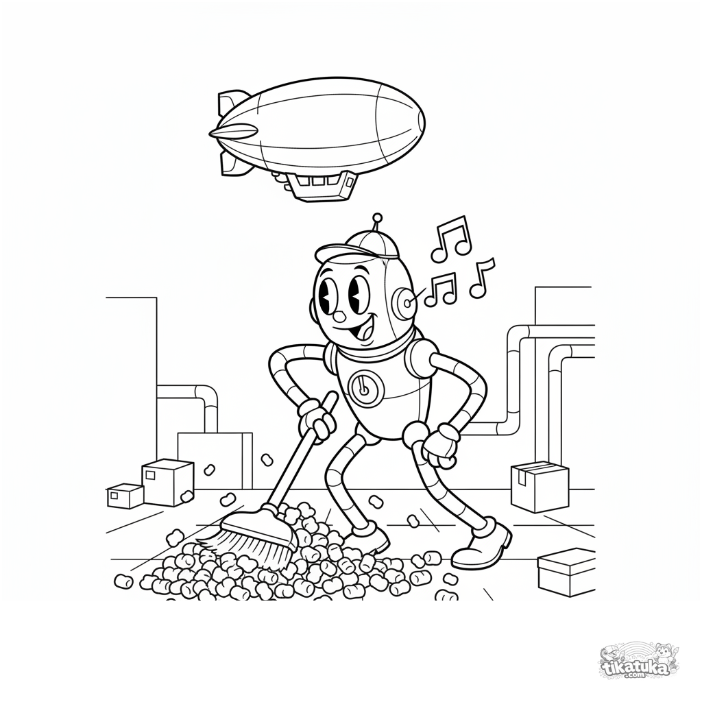 Ausmalbild für Kinder 4-6: Ein fröhlicher Hausmeister-Roboter im Vintage-Cartoon-Stil fegt Konfetti im Lager. Biegsame Gliedmaßen, ausdrucksstarke Augen.