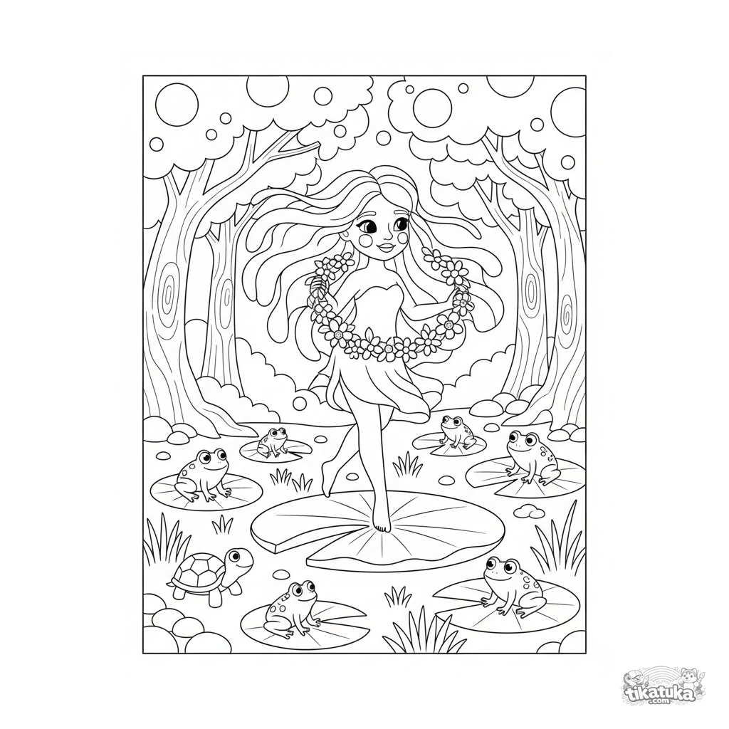 Ausmalbild für Kinder: Eine fröhliche Flussnymphe tanzt mit Tieren in einem alten Wald. Eine farbenfrohe und freundliche Szene, geeignet für Kinder von 4-8 Jahren.