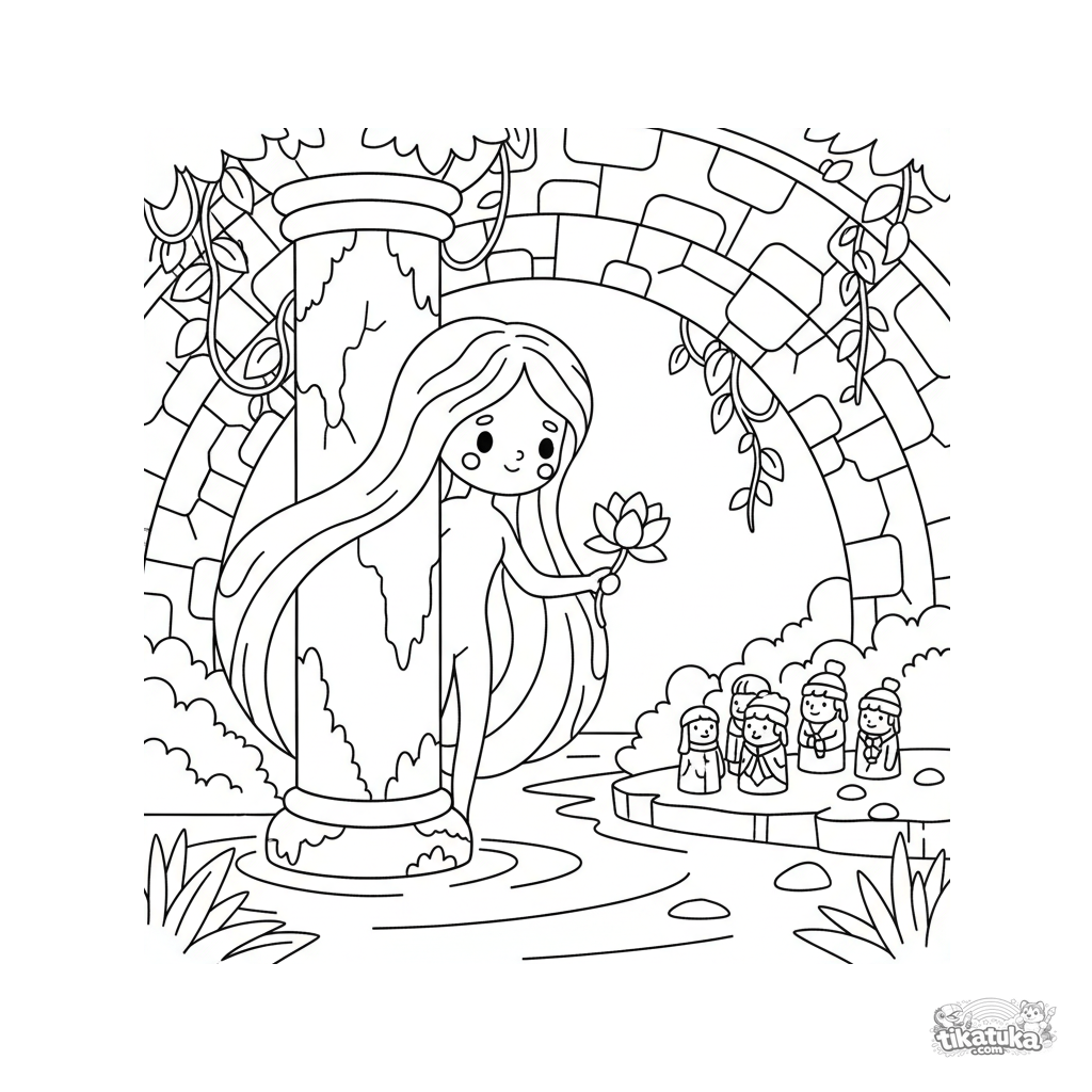 Ausmalbild für Kinder: Eine Flussnymphe bietet Reisenden an einer zerstörten Brücke in Amphitheater-Ruinen eine Blume an. Eine freundliche Begegnungsszene aus Mythen.