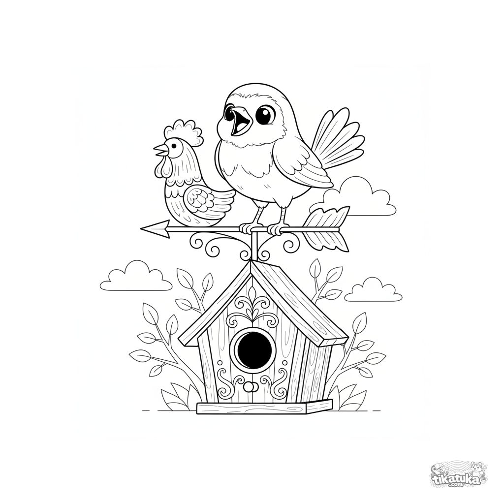 Ausmalbild für Kinder 7-9: Ein Rotkehlchen im Folk-Lubok-Stil singt, während es auf einer wetterfahne in Hahnenform auf einem Holz-Vogelhaus in einem Dorfgarten steht. Dekorative Muster, mäßiges Detail.