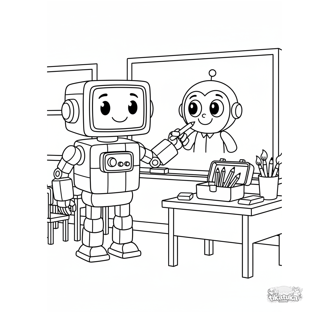 Ausmalbild: Ein freundlicher Roboter-Kunstlehrer zeichnet eine Cartoon-Figur an die Klassenzimmertafel. Für Kinder von 4-6 Jahren. Details: Stift, Werkzeugkasten, Pinsel.