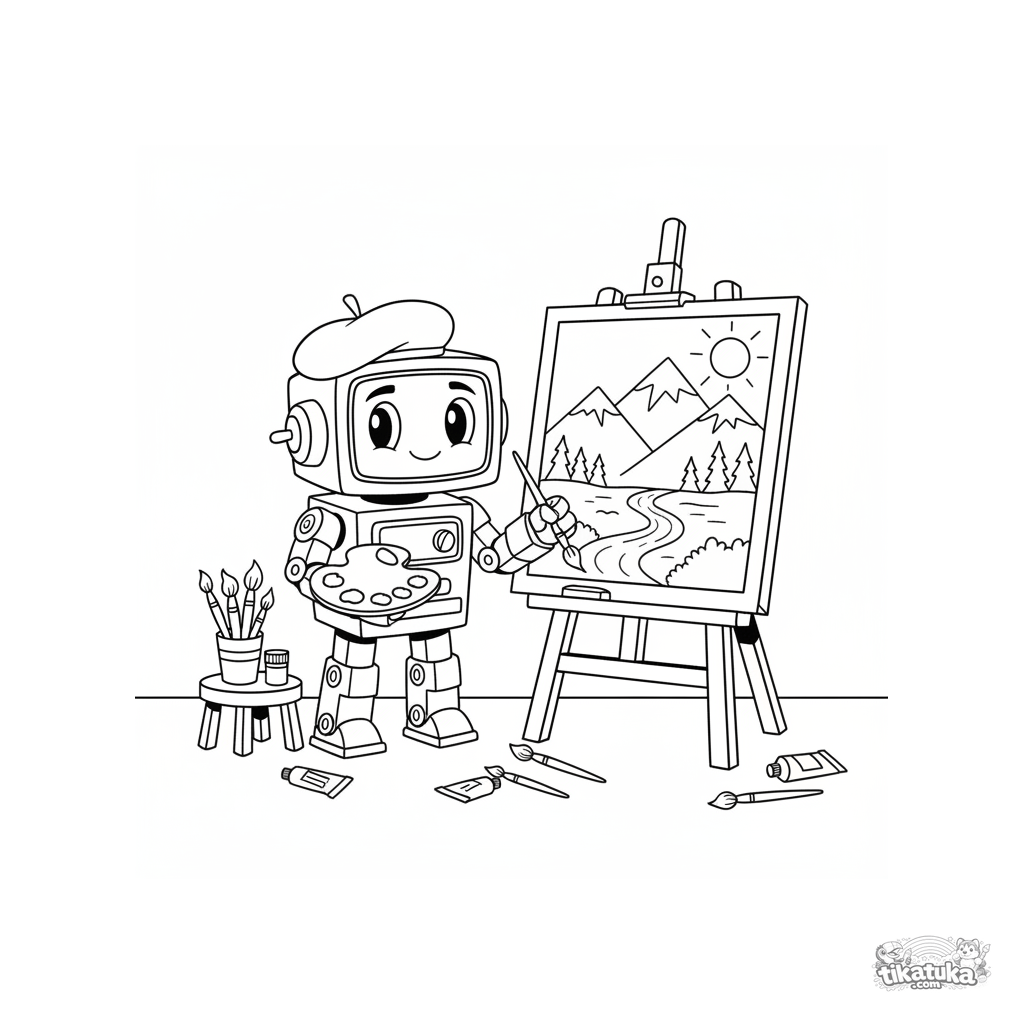 Ausmalbild für ältere Kinder 10-12: ein Roboter-Künstler mit Barett malt eine Landschaft an einer Staffelei im Klassenzimmer. Pinsel, Farben und eine Palette sind in der Nähe.