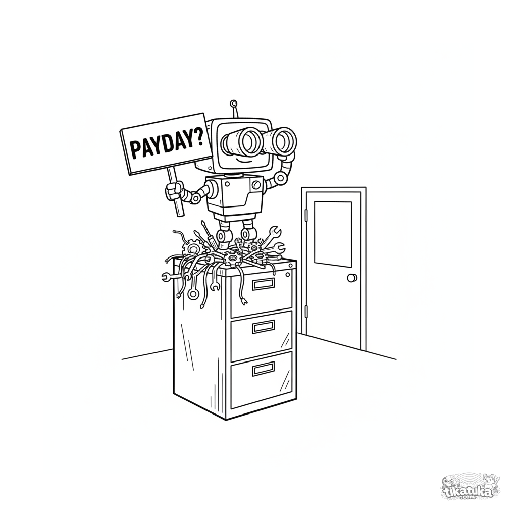 Ausmalbild für Kinder 10-12: Ein Roboter-Assistent auf einem Aktenschrank mit Teleskopaugen sucht die Gehaltsabteilung. Lustige Tech-Szene im Comic-Stil.