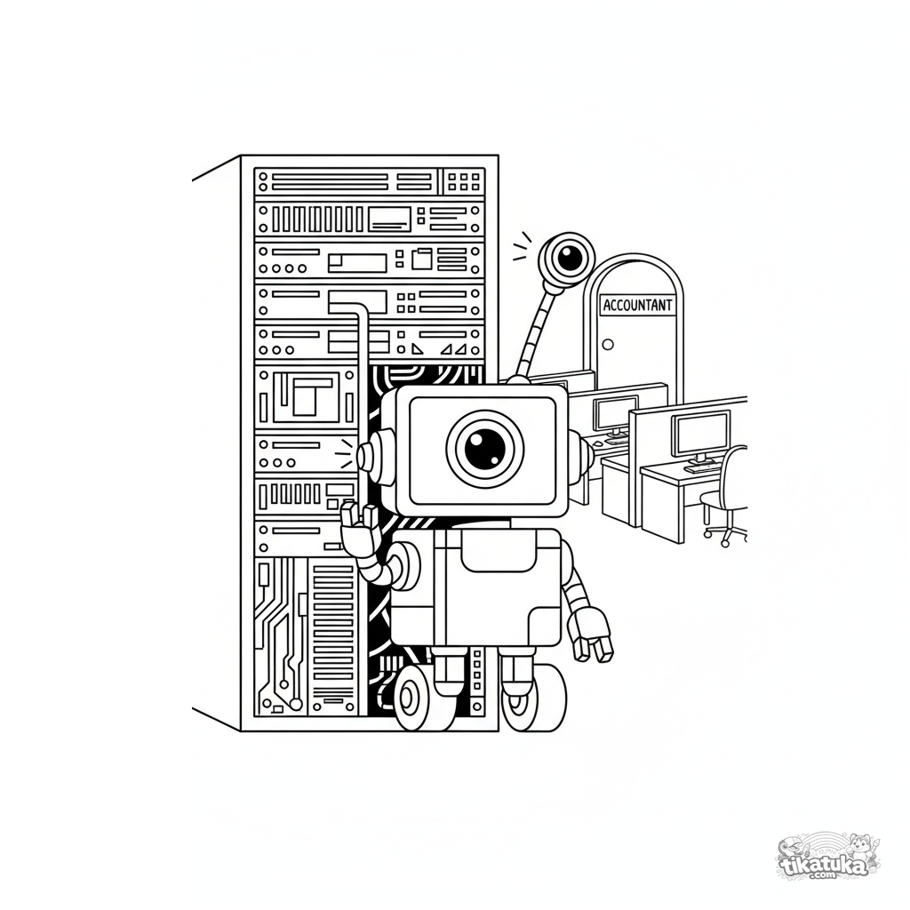 Ausmalbild für Kinder 10-12: Ein Roboter-Assistent lugt mit einem Periskop aus einem Serverrack hervor und sucht sein Gehalt. Detaillierte Szene im Graphic-Novel-Stil.