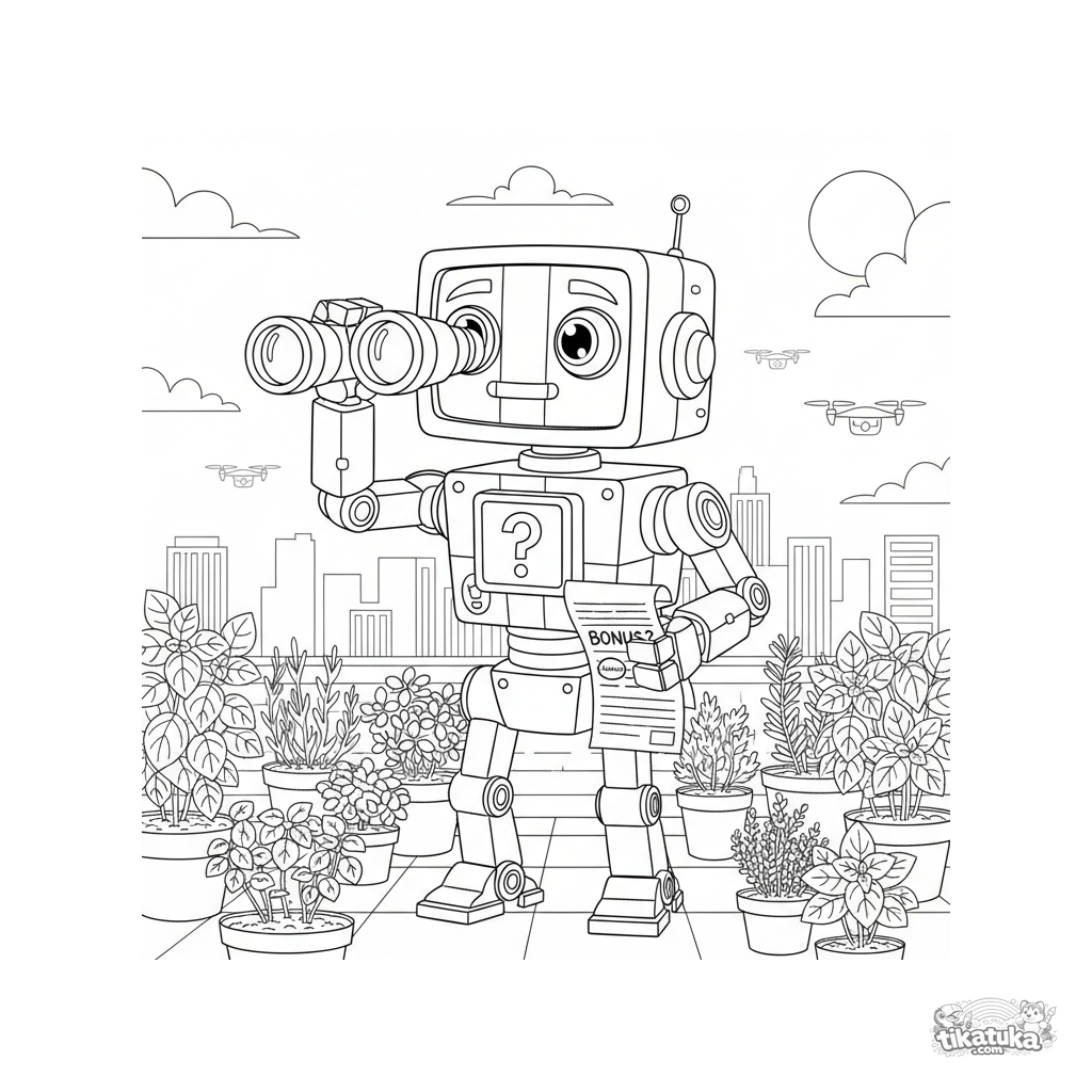Ausmalbild für Tweens: Ein freundlicher Roboter-Assistent mit Fernglas auf einem Dachgarten, auf der Suche nach einer Lieferdrohne. Detaillierte Szene im technischen Blaupausen-Stil mit Humor.