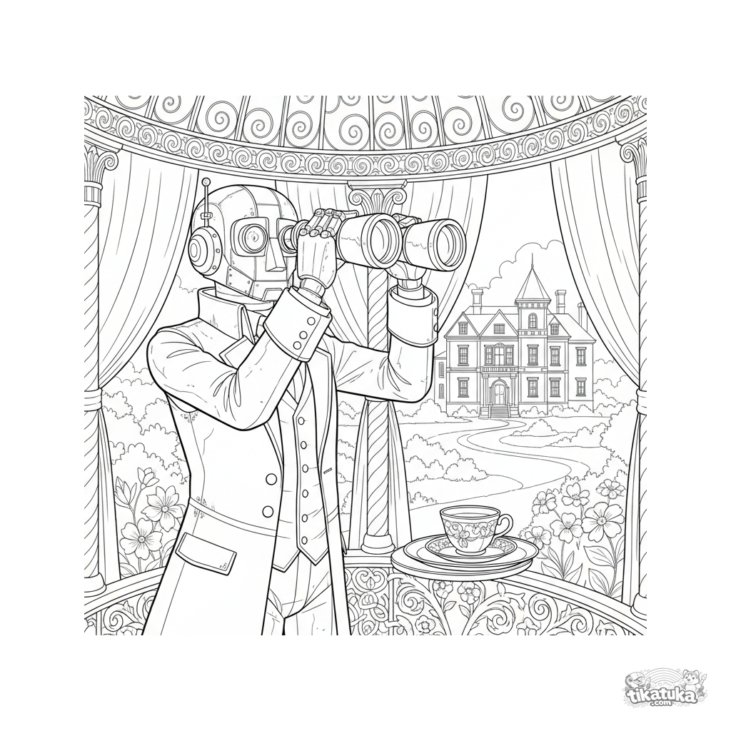 Ausmalbild für Kinder 10-12: Ein Roboter-Butler im Steampunk-Stil sucht mit einem Fernglas von einem Gartenpavillon aus. Detaillierte Szene mit humorvollen Untertönen.