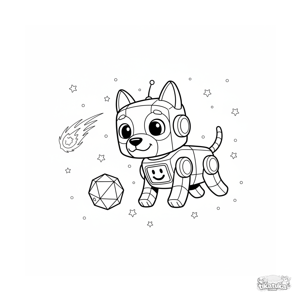 Ausmalbild für 7-9 Jahre: Ein fröhlicher Roboterhund im Flat-Vector-Stil spielt Apportieren mit Weltraumschrott in der Nähe eines Kometen im sternenübersäten Weltraum.