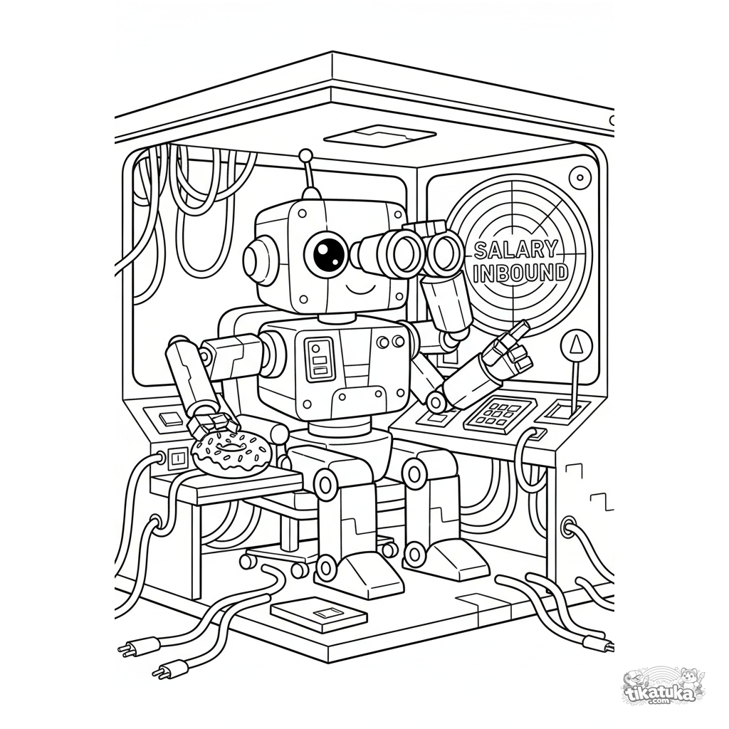 Ausmalbild für Kinder 10-12: Ein Roboter-Sicherheitswache in einer Kabine sucht mit Fernglas und Monitor den Gehaltstag. Futuristische, lustige, detaillierte Szene.