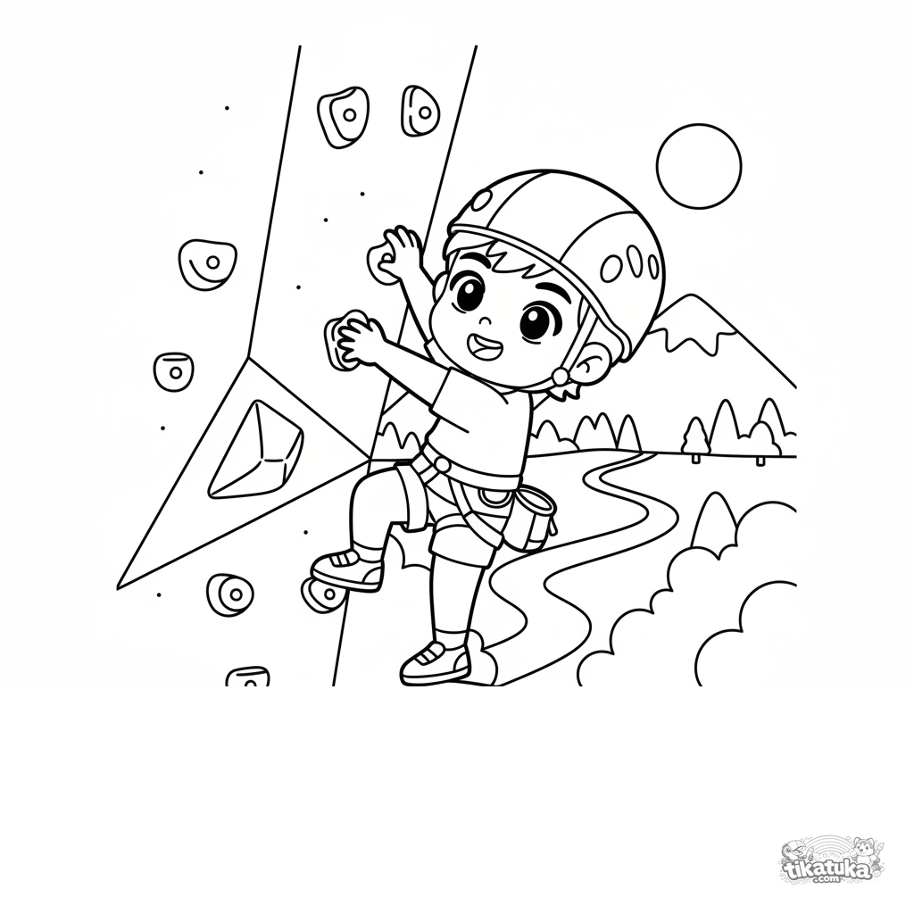 Ausmalbild für Kinder: Ein junger Kletterer mit Helm greift nach dem nächsten Griff an einer Übungswand. Für 4-6 Jahre.