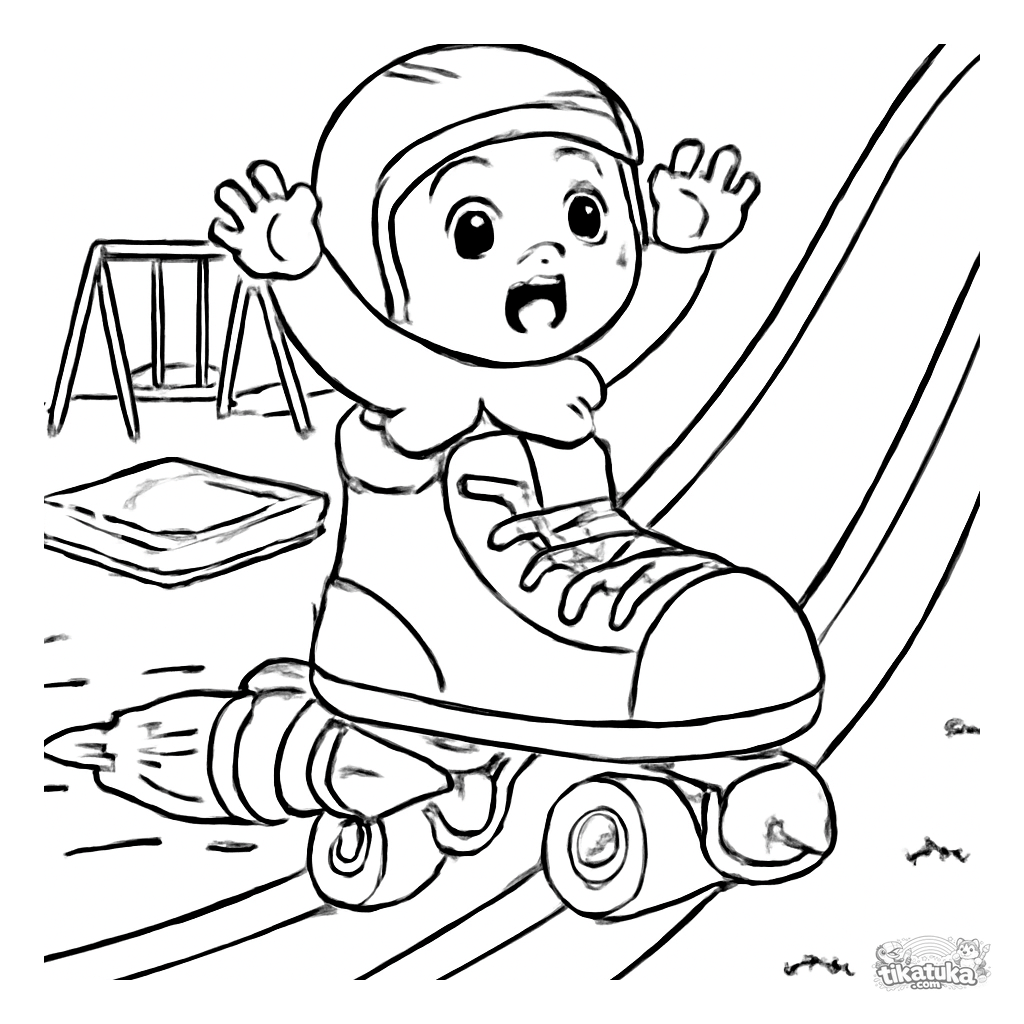 Lustiges Ausmalbild eines raketenbetriebenen Rollschuhs, der eine Rutsche hinuntersaust. Für Kinder von 5-8 Jahren. Dynamisches Bild des gesamten Fahrzeugs.