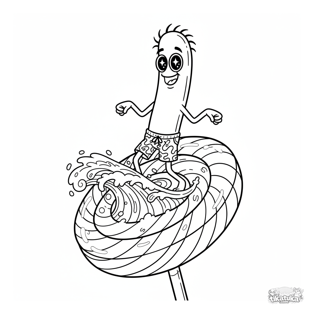 Detailliertes Ausmalbild für ältere Kinder 10-12 Jahre: Ein stäbchenförmiges Bakterium in Badehose reitet eine Zuckerwelle auf einem Regenbogen-Lollipop. Dynamische Szene, hohes Detail.