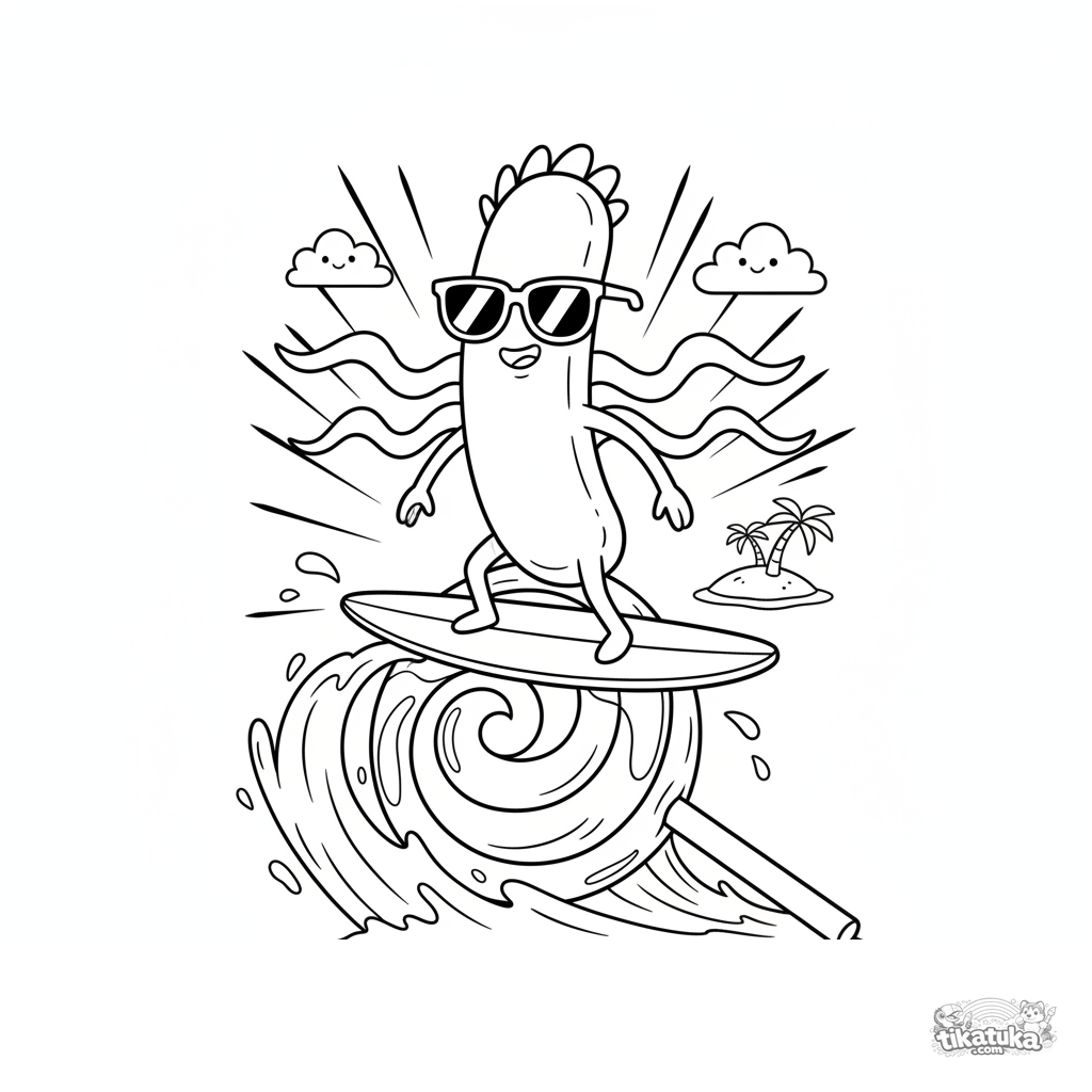 Ausmalbild für Kinder 7-9: Ein stäbchenförmiges Bakterium mit Sonnenbrille surft gekonnt auf einer Welle aus Lollipop. Dynamische Actionszene.