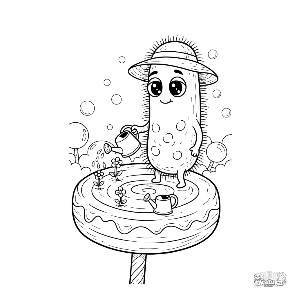 Ausmalbild für Kinder 4-6: Eine längliche stäbchenförmige Mikrobe gießt Zuckerblumen auf einem Lollipop. Freundliche, friedliche Szene im Bilderbuchstil.