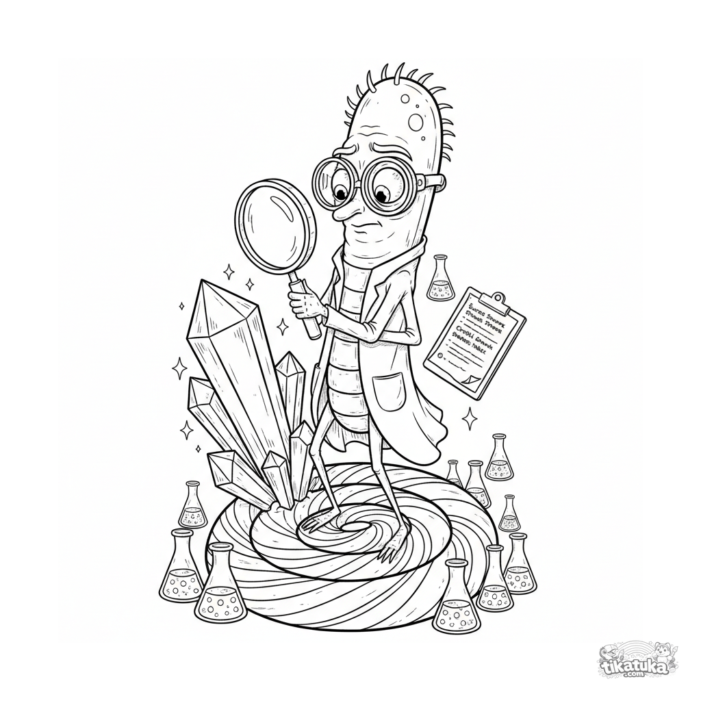 Detailliertes realistisches Ausmalbild für Kinder 10-12: Ein stäbchenförmiger Mikroben-Wissenschaftler mit Schutzbrille und Laborkart studiert Zuckerkristalle auf einer Lollipop-Oberfläche. Szene im Feldführer-Stil.