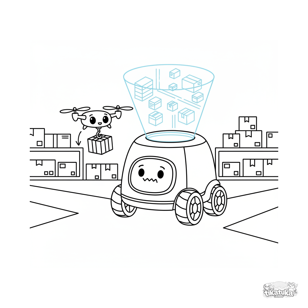 Ausmalbild für Kinder 7-9: Ein Lieferroboter mit Karte im Lager zwischen Drohnen. Dynamische Szene mit Elementen zukünftiger Navigation und Logistik.