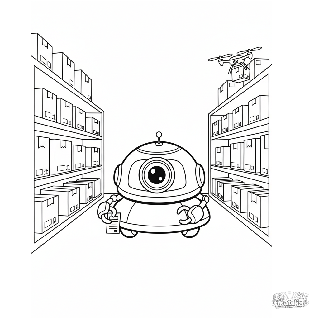 Ausmalbild für Kinder 4-6: Ein Roboter auf Rädern scannt Kisten in einem Lager. Klare Umrisse, mäßiges Detail.