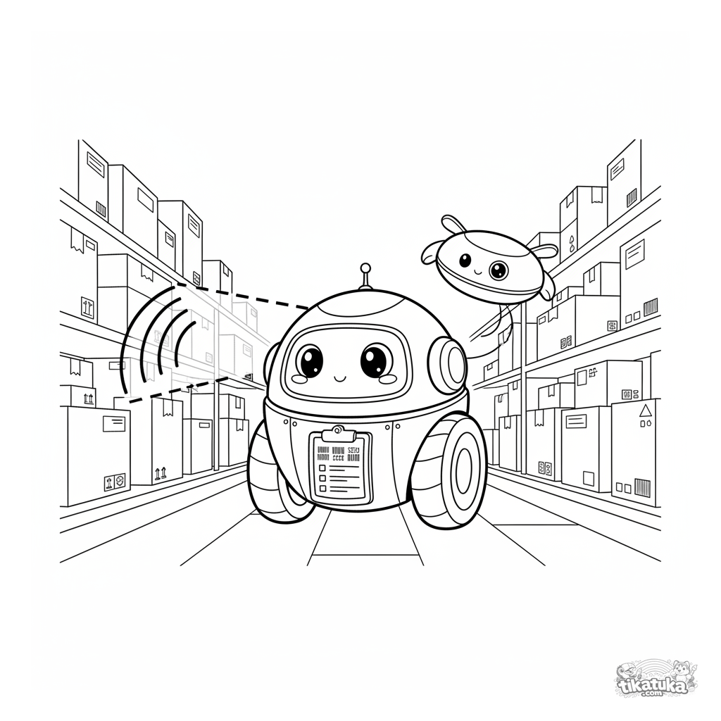 Ausmalbild für Kinder 4-6 Jahre: ein runder Roboter auf Rädern rollt einen Lagerhausgang entlang und scannt Barcodes auf Kisten. Eine Helfer-Drohne fliegt daneben. Saubere geometrische Formen.