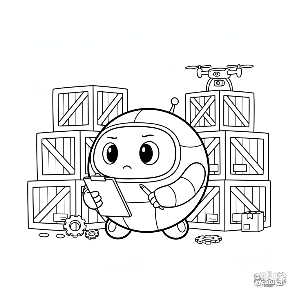 Ausmalbild für Kinder 4-6: Ein runder Rollroboter prüft das Inventar mit einem Klemmbrett, zwischen hohen Stapeln von Kisten in einem Lagerhaus.