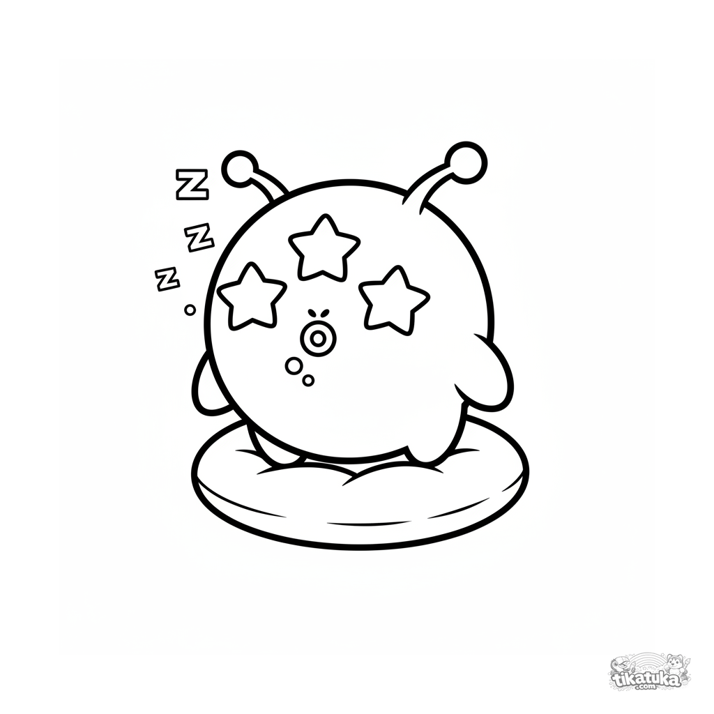 Kawaii-Ausmalbild für Kleinkinder 2-3: ein runder freundlicher Alien schläft über einem Kissen. Sehr einfache Formen.