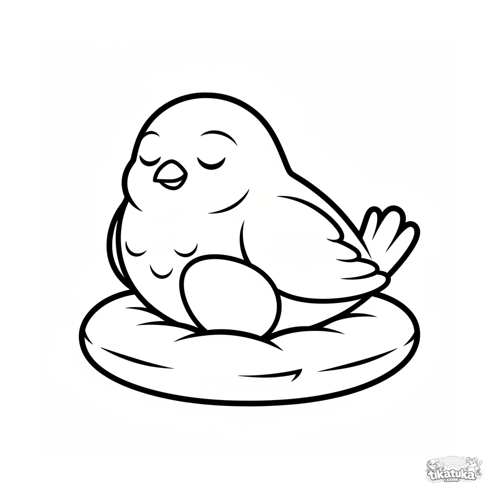 Feldhandbuch-Stil Ausmalbild für Kleinkinder: ein Vogel sitzt auf einem Ei auf einem Kissen. Klare Umrisse, erkennbare Form, vereinfachte Details.