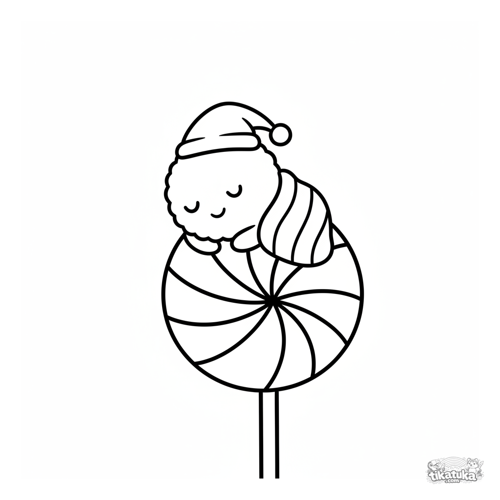 Einfaches Ausmalbild für Kleinkinder 2-3: eine runde Mikrobe mit Schlafmütze schläft auf einem Lutscher. Große Formen, wenige Details.