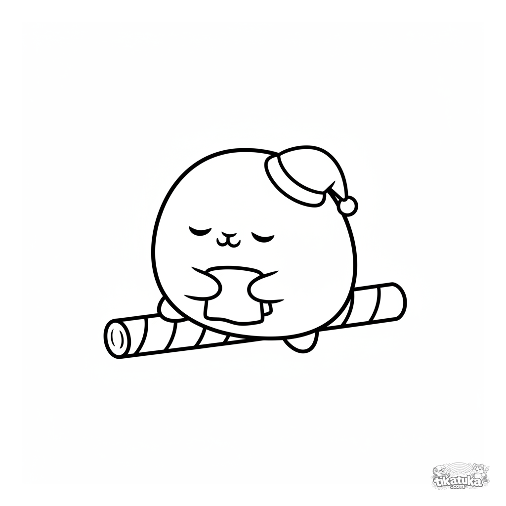 Einfaches Ausmalbild für Kleinkinder 2-3 Jahre: Eine runde Plüsch-Mikrobe schläft mit einer Schlafmütze auf einem Lollipop. Große Formen, wenige Details.