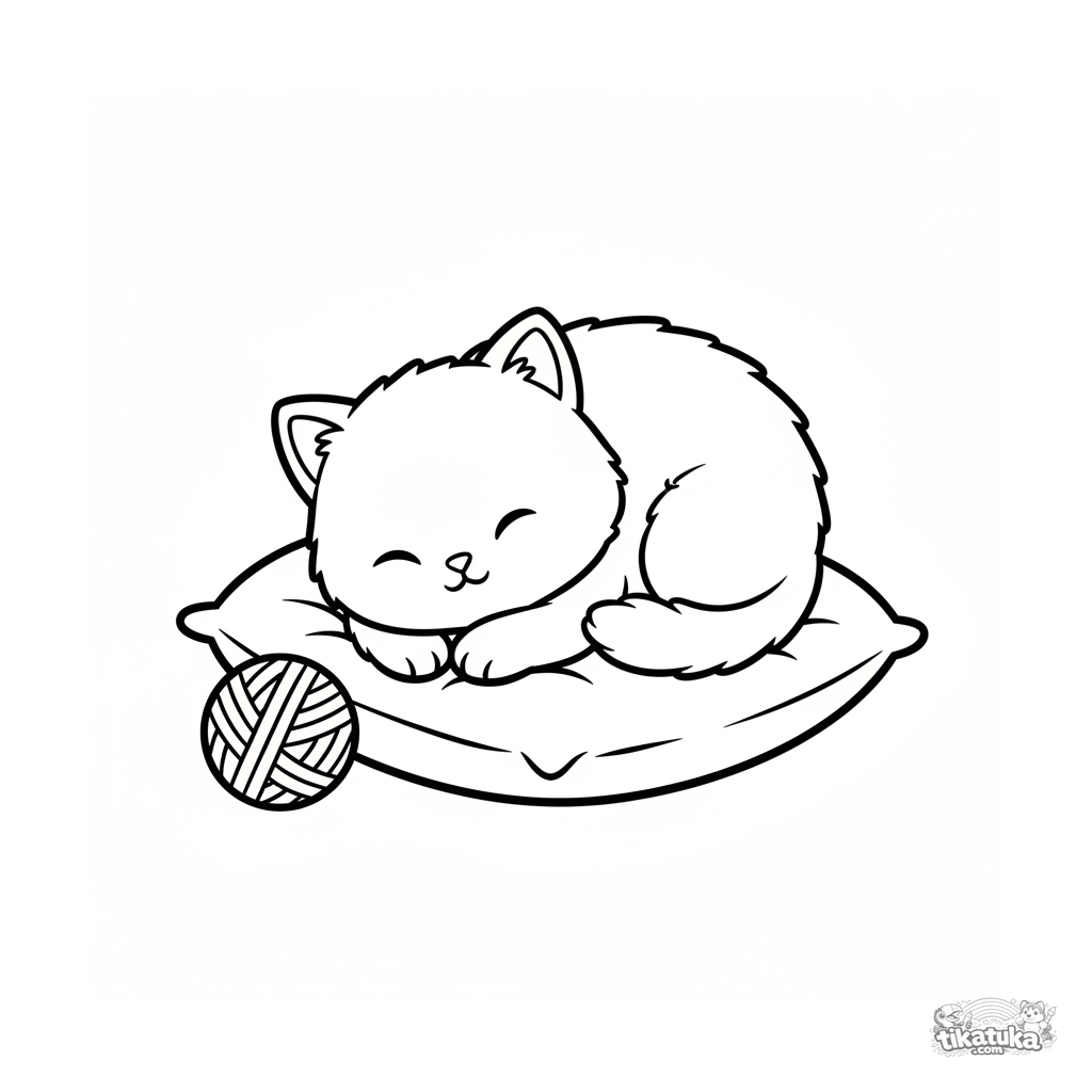 Einfaches Ausmalbild für Kleinkinder 2-3 Jahre: ein rundes, flauschiges Kätzchen schläft auf einem weichen Kissen neben einem Wollknäuel. Sehr große, klare Formen.