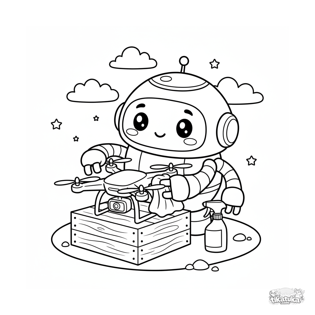 Ausmalbild für 7-9 Jahre: Ein runder Reinigungsroboter poliert sorgfältig die Propellerblätter einer kleinen Drohne, die auf einer Kiste in einer Lagerhalle ruht, mit einem Tuch und einer Sprühflasche in der Nähe.