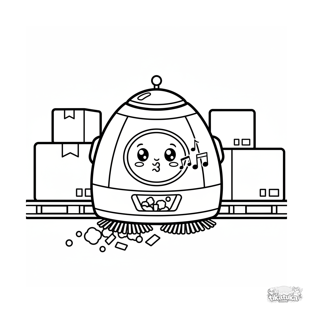 Einfaches Ausmalbild eines runden Reinigungsroboters, der den Lagerhausboden fegt. Für Kleinkinder von 2 bis 3 Jahren.