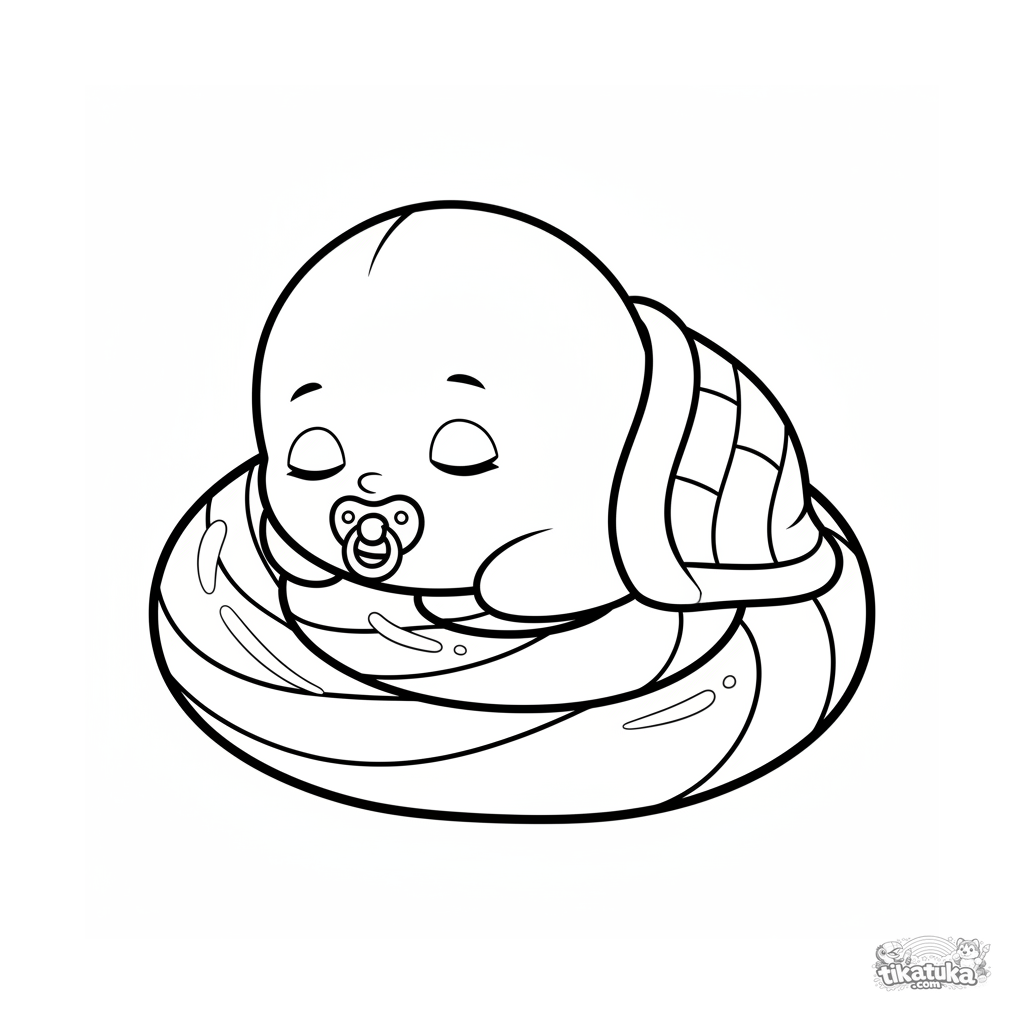 Einfaches Ausmalbild für Kleinkinder 2-3: ein rundes Mikroben-Baby schläft mit Schnuller auf einem großen Lollipop. Große Formen und viel Freiraum zum Ausmalen.
