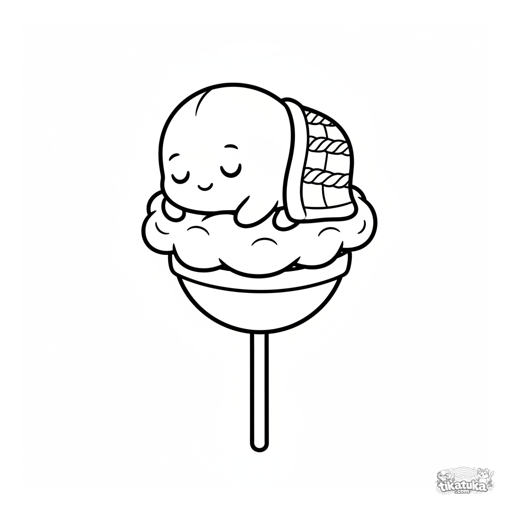 Sehr einfaches Ausmalbild für Kleinkinder 2-3: Eine runde, plüschige Mikrobe schläft auf einer Zuckerwattewolke auf einem Riesenlolli. Große, geschlossene Formen.