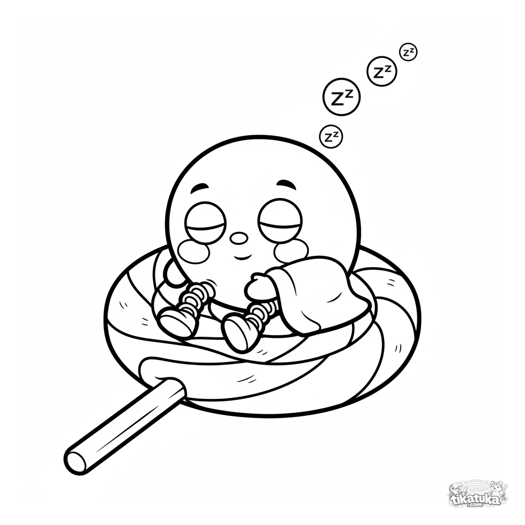 Einfaches Ausmalbild für Kleinkinder von 2-3 Jahren: Ein runder Plüsch-Mikrobe schläft auf einem Lollipop. Große Formen, wenige Details, perfekt für erste Buntstifte.