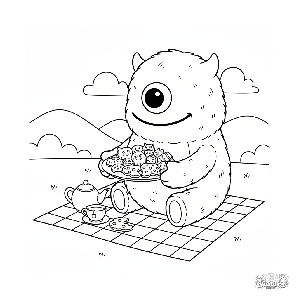 Ausmalbild für Kinder 4-6 Jahre: ein rundes, flauschiges Monster mit einem Auge bietet einen Teller mit Keksen auf einem Picknick an. Eine warmherzige Szene über Freundschaft und Großzügigkeit.